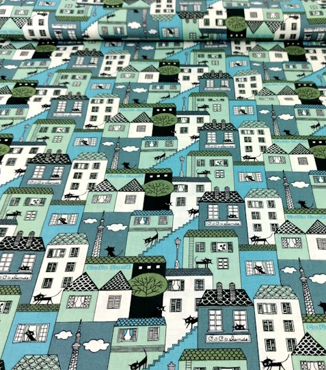 Bavlněná látka domky tyrkysovéSkladem 39 m89 Kč/ m74 Kč bez DPH