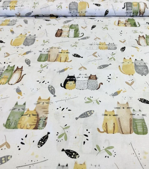 Bavlněná látka kočičí rodinka žlutáSkladem 39 m89 Kč/ m74 Kč bez DPH