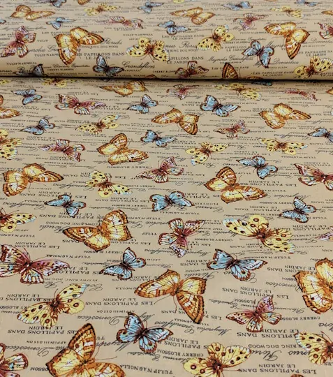 Bavlněná látka motýlci na béžovéSkladem 1 m89 Kč/ m74 Kč bez DPH