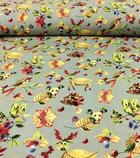 Bavlněná látka zvířátka z listíSkladem 39 m89 Kč/ m74 Kč bez DPH