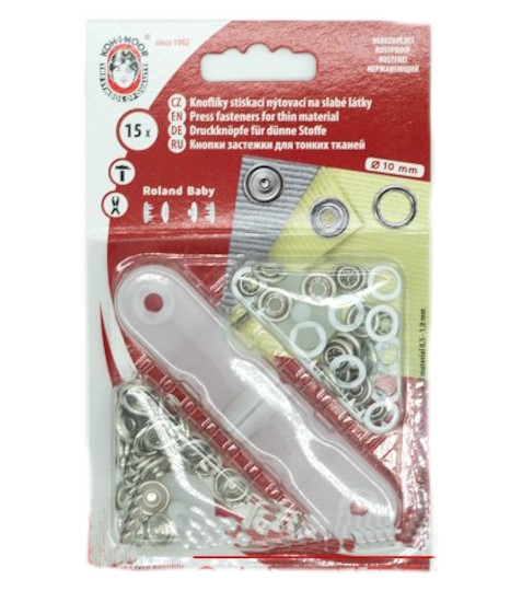 Povrchová úprava - LAK - bílá, růžová, světle modrá...Knoflíky stiskací nýtovací ROLAND BABY slouží ke spojování jemných a poddajných druhů látek jako jsou froté, úplety, košilovina aj. Velikost 10,5 mm. Balení 15ks v blistru s přípravkem na ruční nýtování.