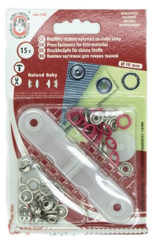 Povrchová úprava - LAK - bílá, růžová, světle modrá...Knoflíky stiskací nýtovací ROLAND BABY slouží ke spojování jemných a poddajných druhů látek jako jsou froté, úplety, košilovina aj. Velikost 10,5 mm. Balení 15ks v blistru s přípravkem na ruční nýtování.