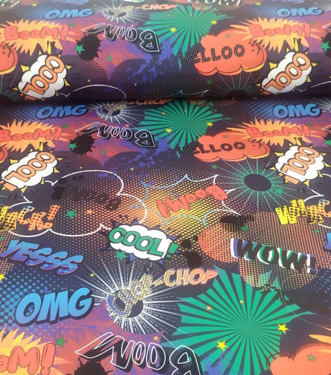 Látka metráž zimní softshell komiks na rubové straně modrý fleece (flíz). Použití: bundy, kalhoty, vesty, dětské kombinézy a další.