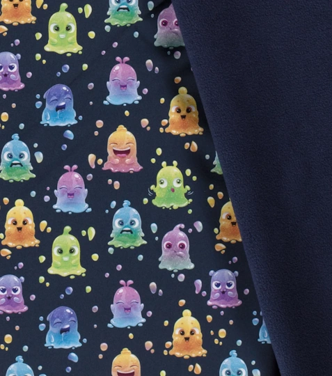 Metráž zimní softshell strašidélka na rubové straně modrý fleece (flíz). Použití: bundy, kalhoty, vesty, dětské kombinézy a další.
