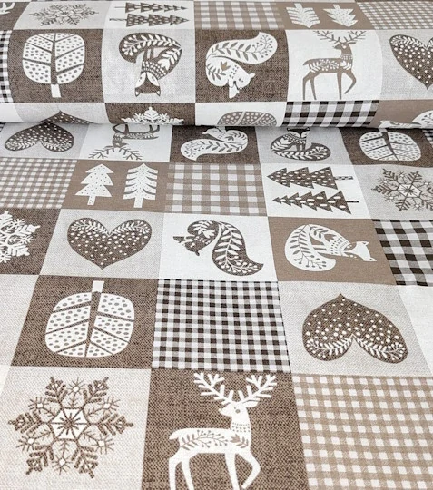 Dekorační látka směsová vánoční patchwork kostka béžová. Použití: ubrusy, prostírání, podsedáky, polštáře, závěsy, dekorace.